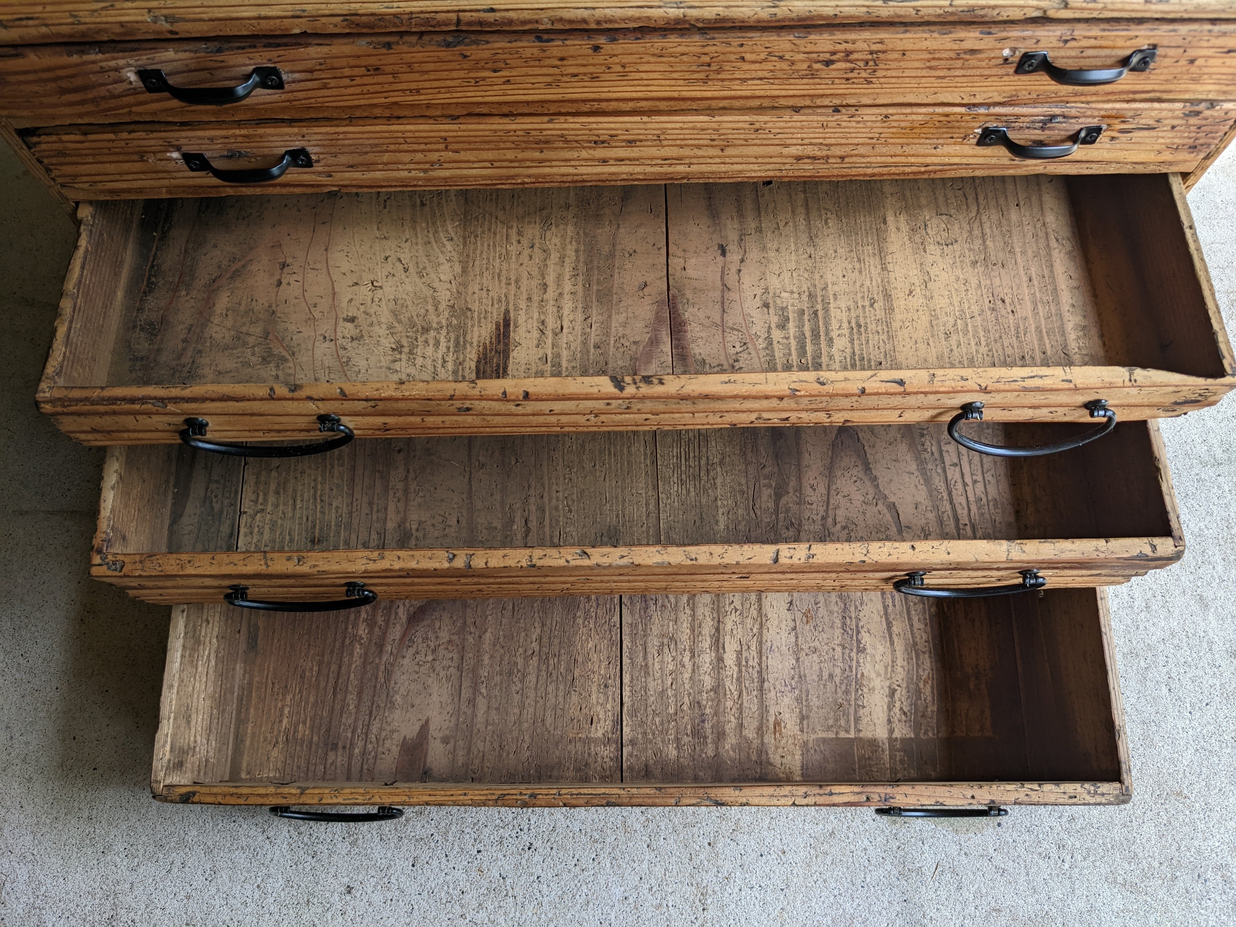 金具は全て新しい物に取り替えてあります。上2段の古い金具穴はパテで埋めてあります。背板に割れ、引き出しの底板にも割れがあります。