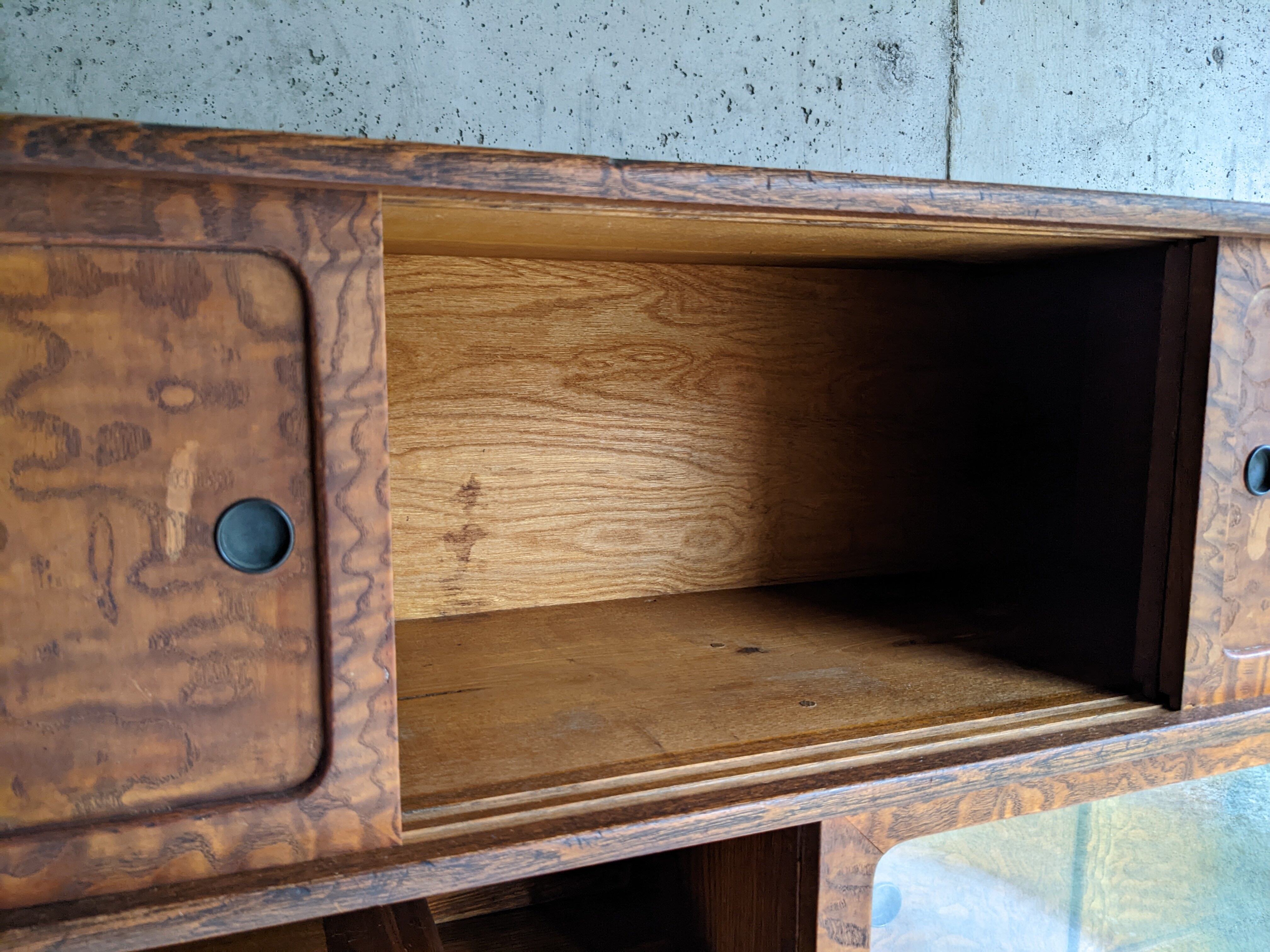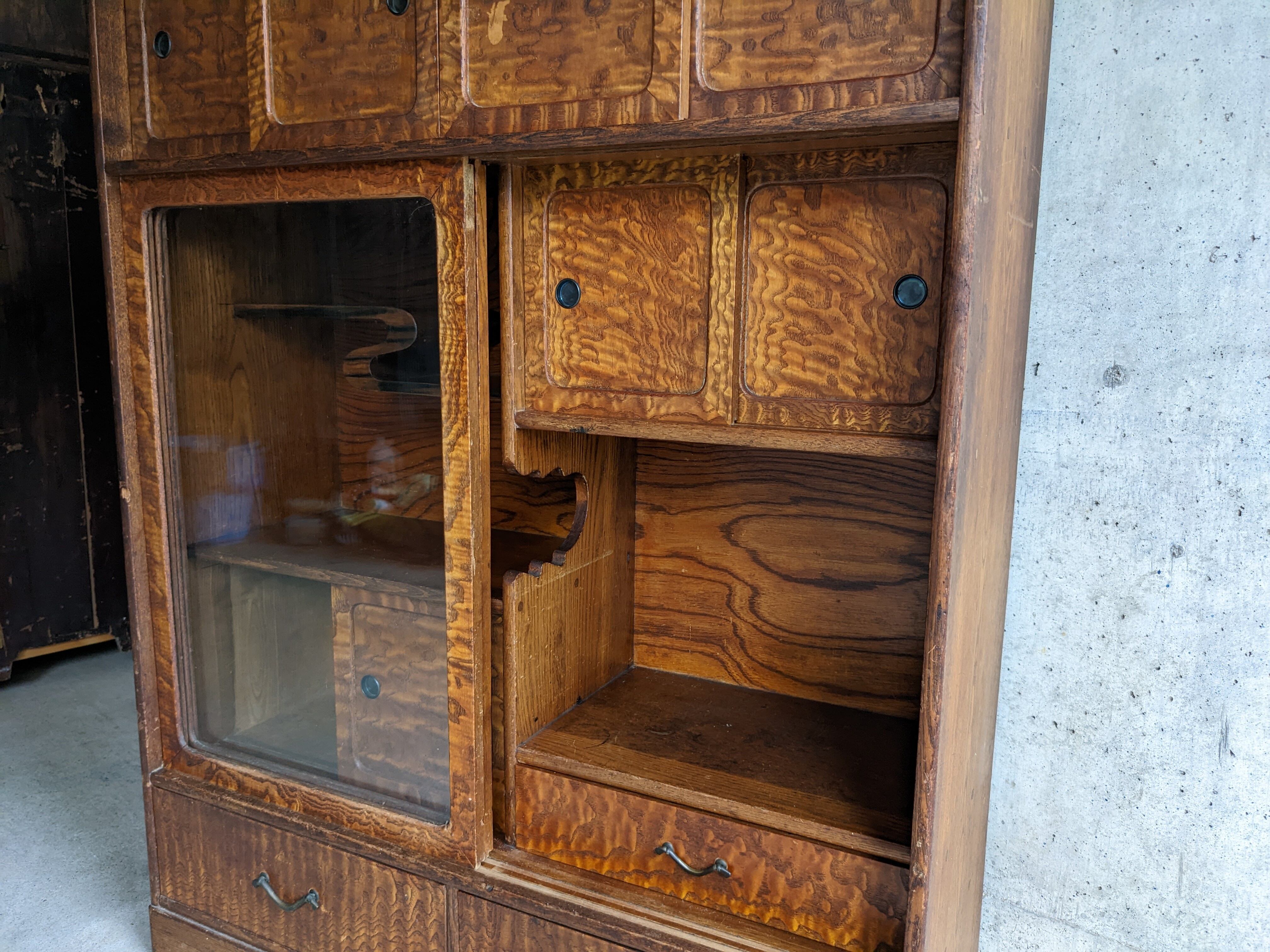 昭和初期頃の作りの良い茶箪笥です。経年による傷や染み等はありますが、塗装等の状態や杢目の出方も良く、古家具独特の雰囲気を醸し出している良品かと思います。