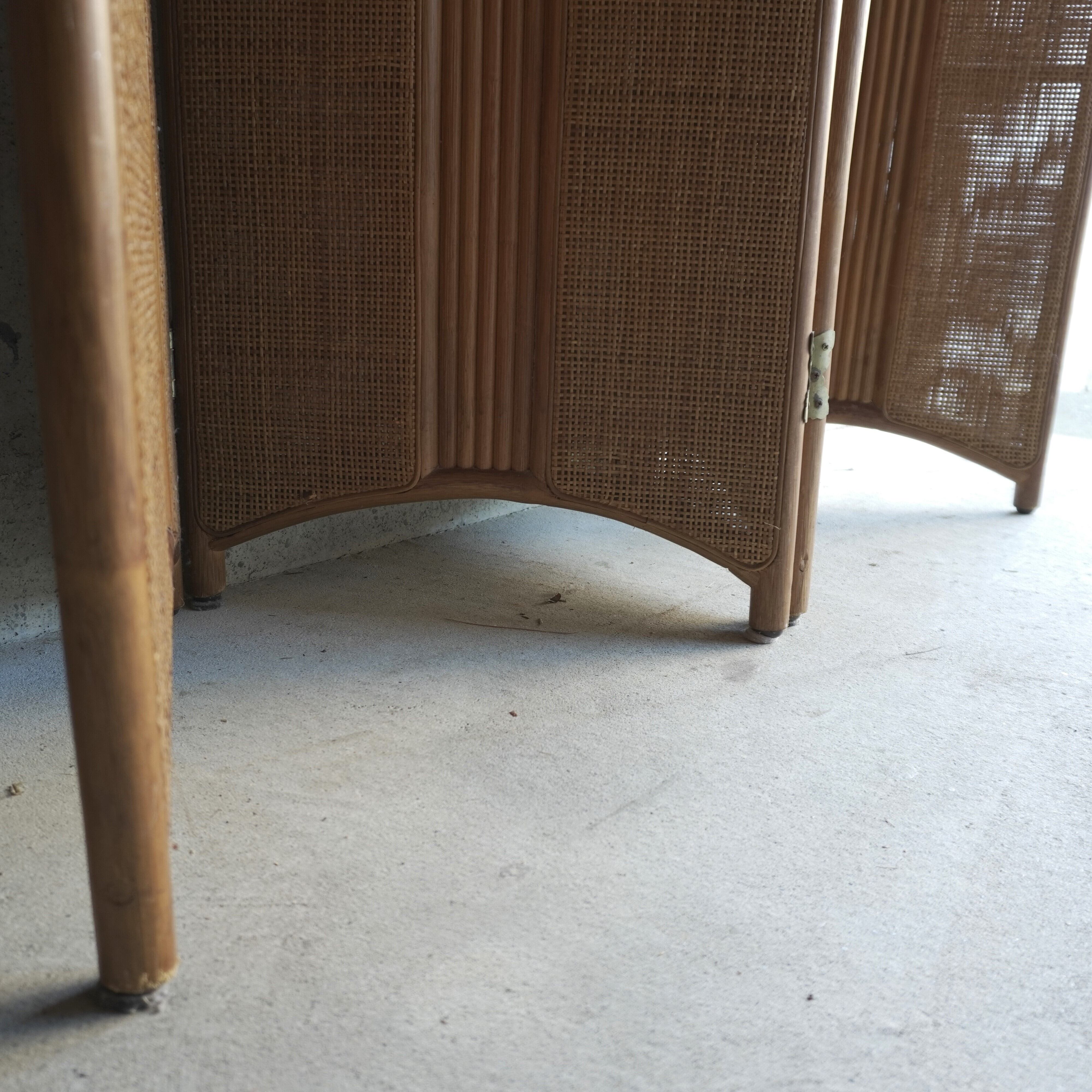 経年変化し、ほうじ茶色に色づいたラタンの4連衝立てです。おそらく20年くらい経年しているのではないかと思われます。
