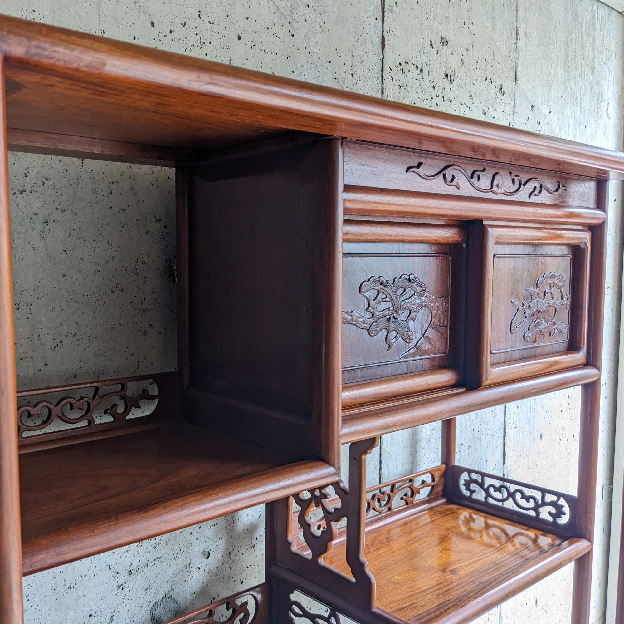 平成中頃くらいの唐木の飾り棚です。材質は花梨で、おそらく台湾で生産されて輸入されたものではないかと思います。