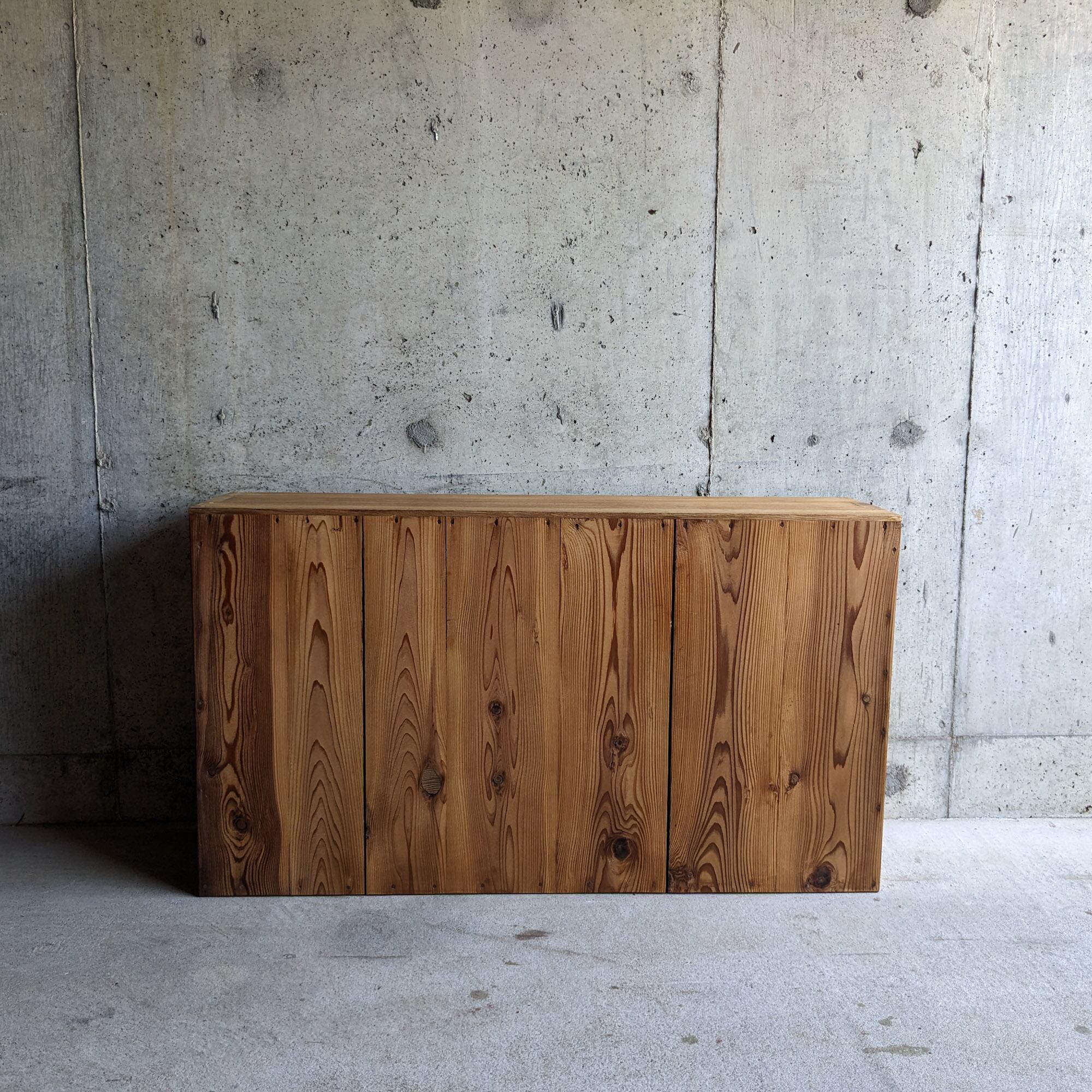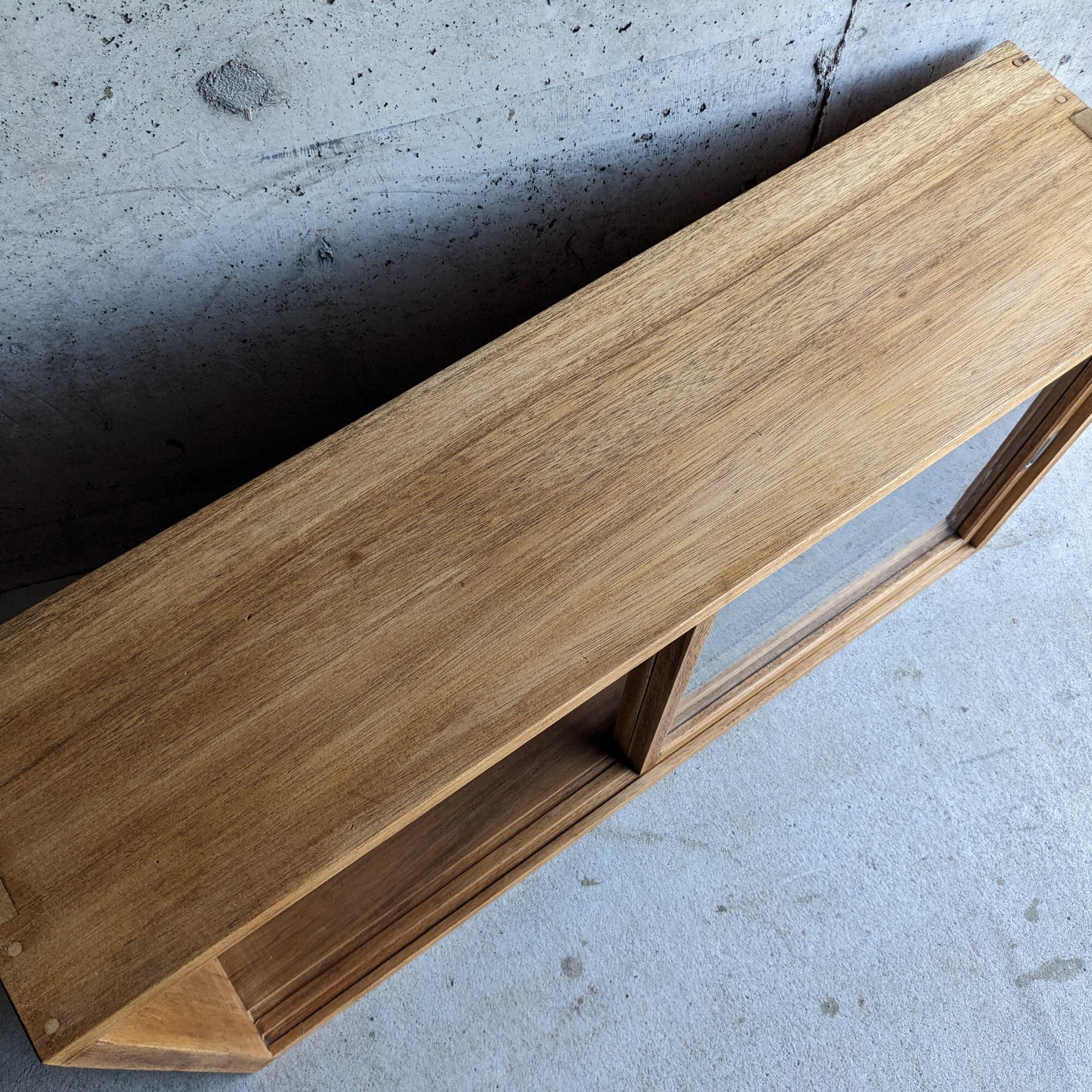 昭和の豆腐屋さんから持ってきた物です。元々は吊り戸棚として使われていましたが、吊り金具を外し、ガラス戸棚として使えるようにしました。