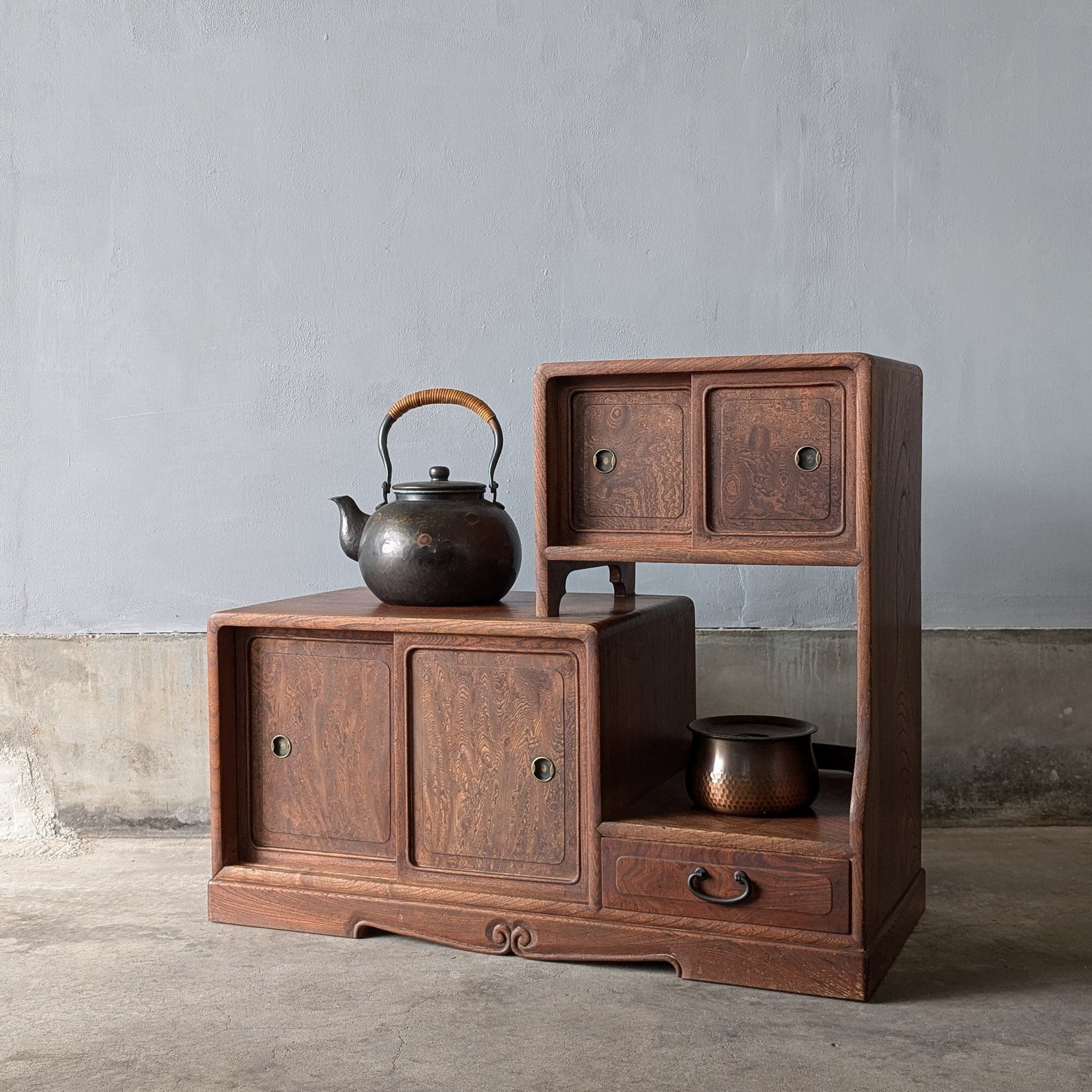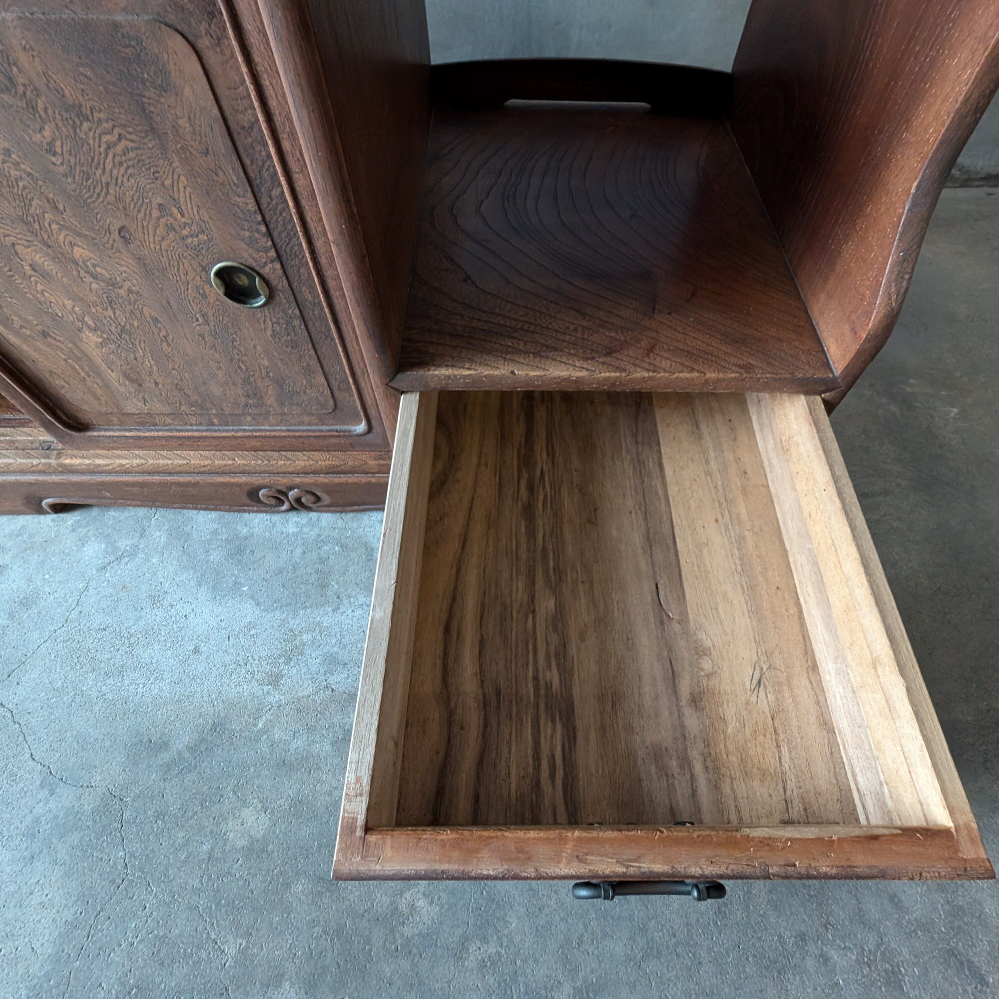 全体が欅のような木で作られており、扉には玉杢の板が使われています。非常に作りの良い品物です。
