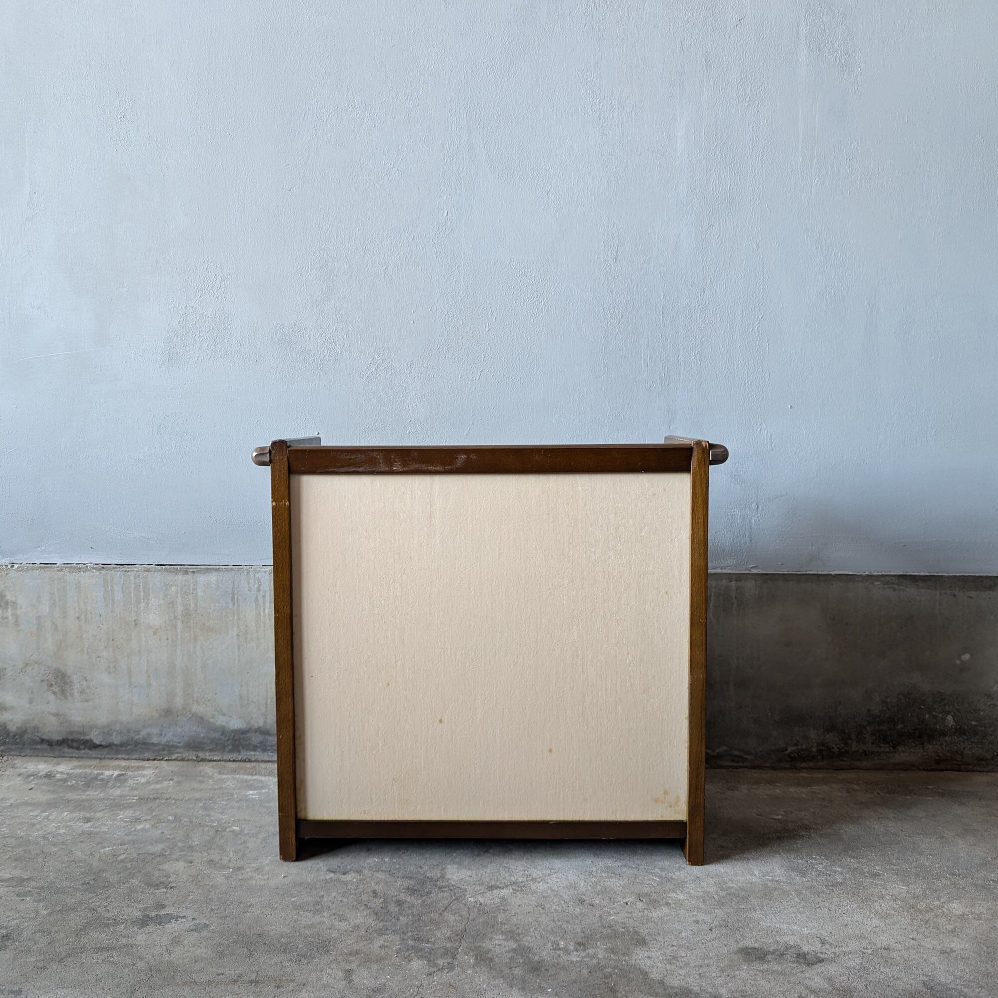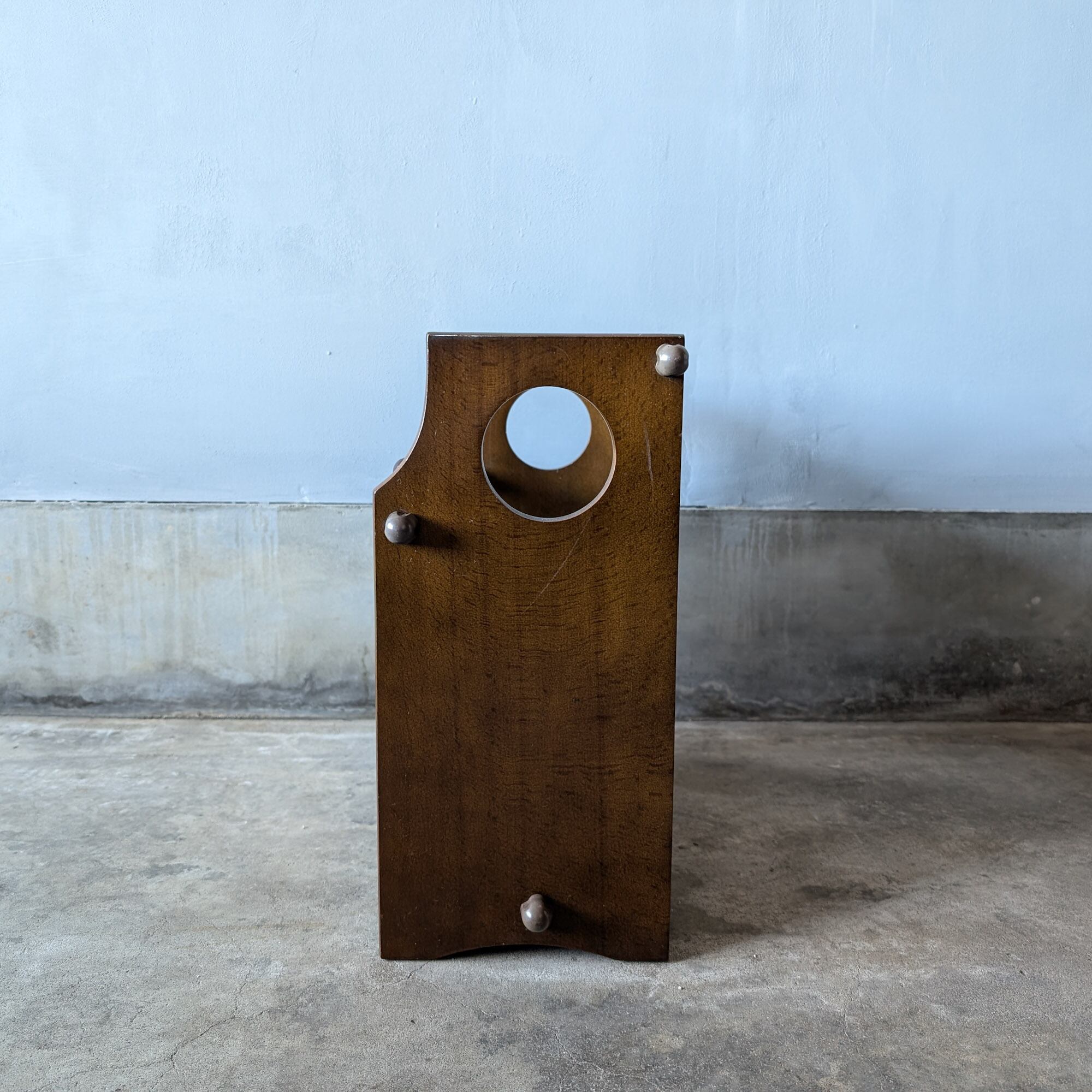 昭和後期頃のマガジンラックです。焼き目を付けたような模様が施されたフェイクレザーが真ん中に張られています。(裏側は無地のフェイクレザー張りになっています。)