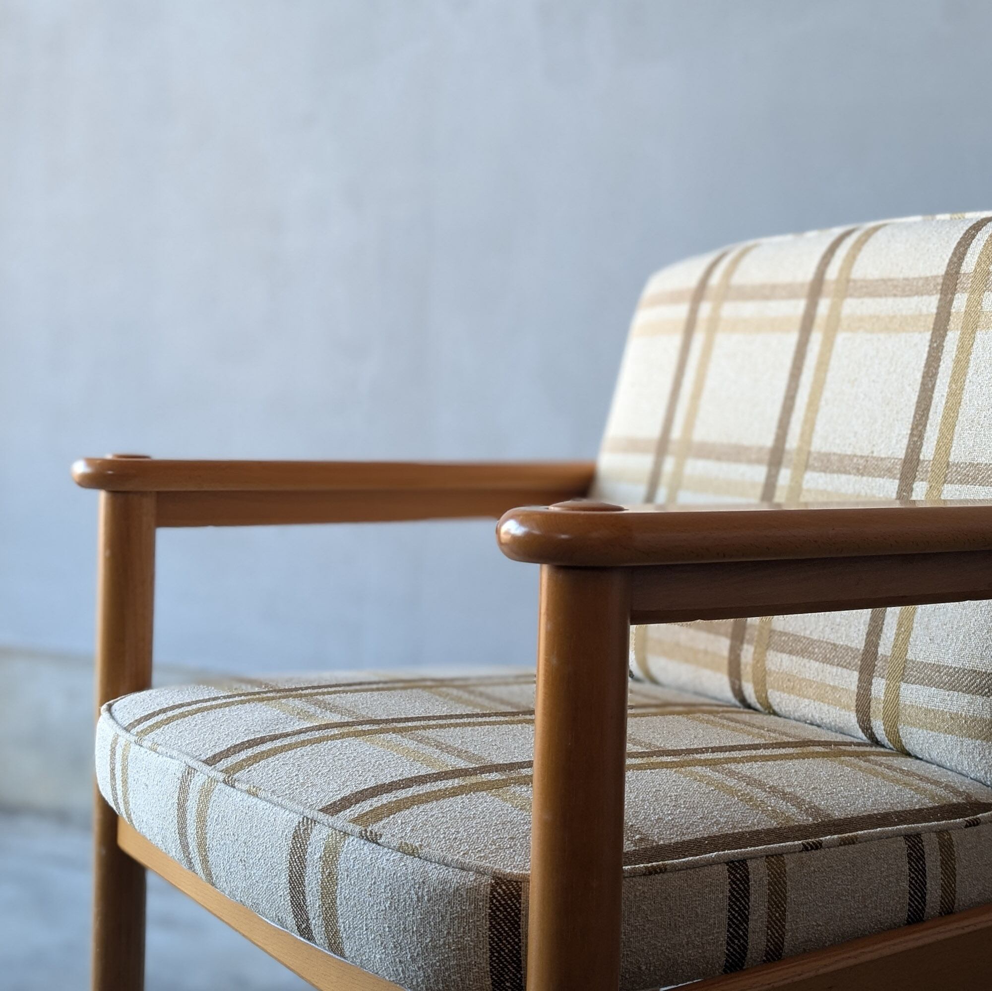 座面には大きめのチェック柄が特徴的なしっかりとしたファブリックが使われています。若干のヘタりや使用感はありますが、破れやほつれもなく、コンディションは良い方かと思います。