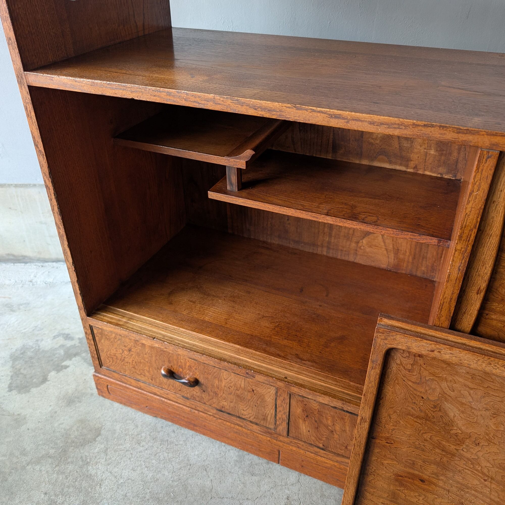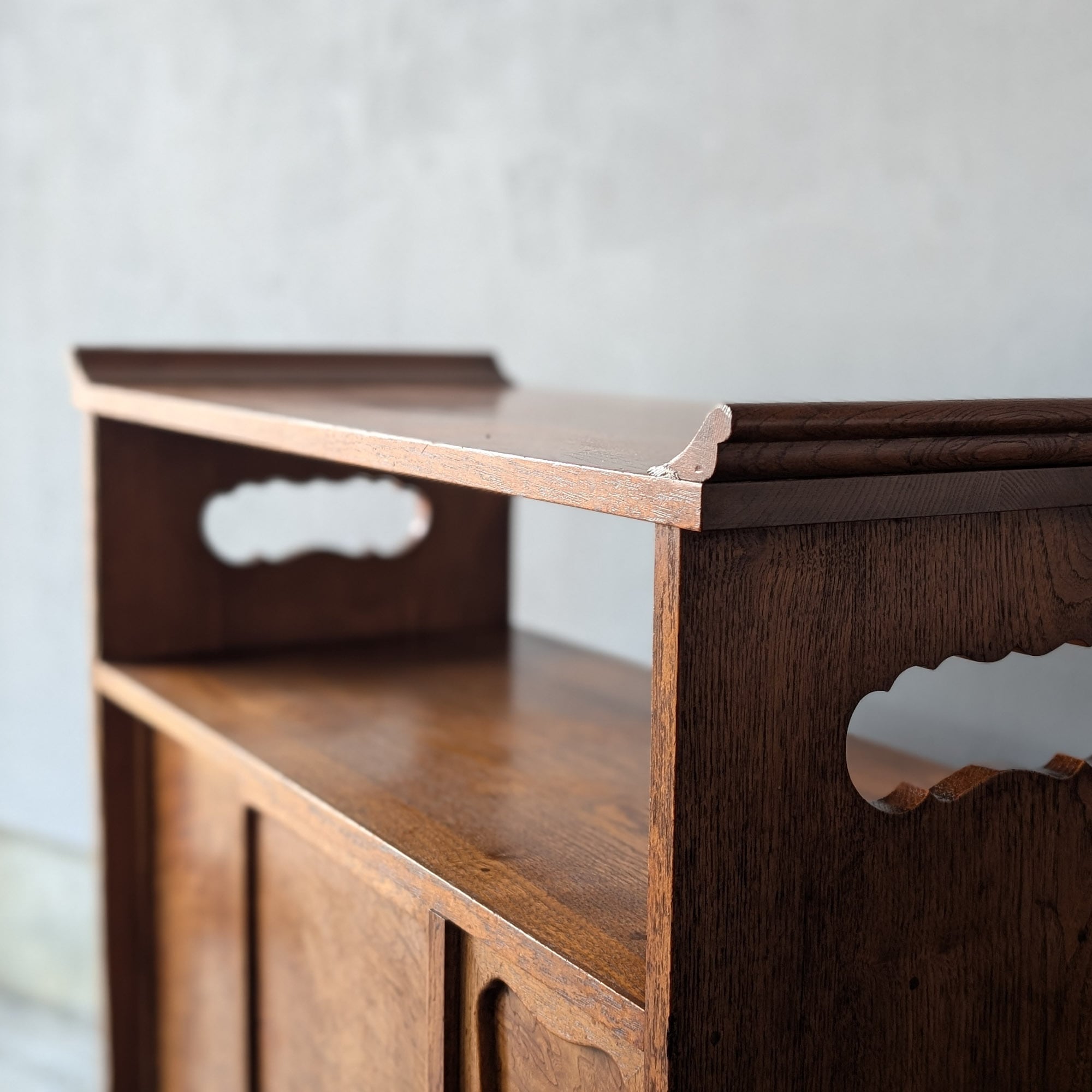 無垢材で作られており、無骨な雰囲気が素敵な逸品です。取っ手や摘みも木材で仕立てられていて、無骨さの中にも遊び心がある意匠となっています。