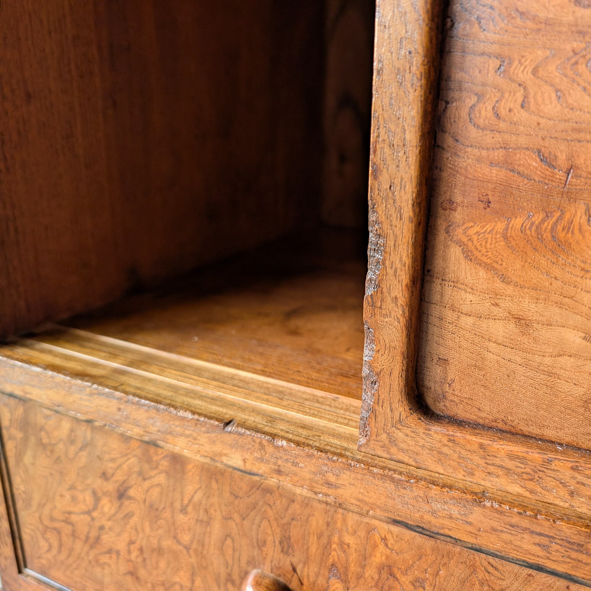 引き出し内部は電動サンダーでヤスリ掛けをしています。向かって右側の天板飾りの角が欠けていたので、異なる木種になりますが補修をしています。