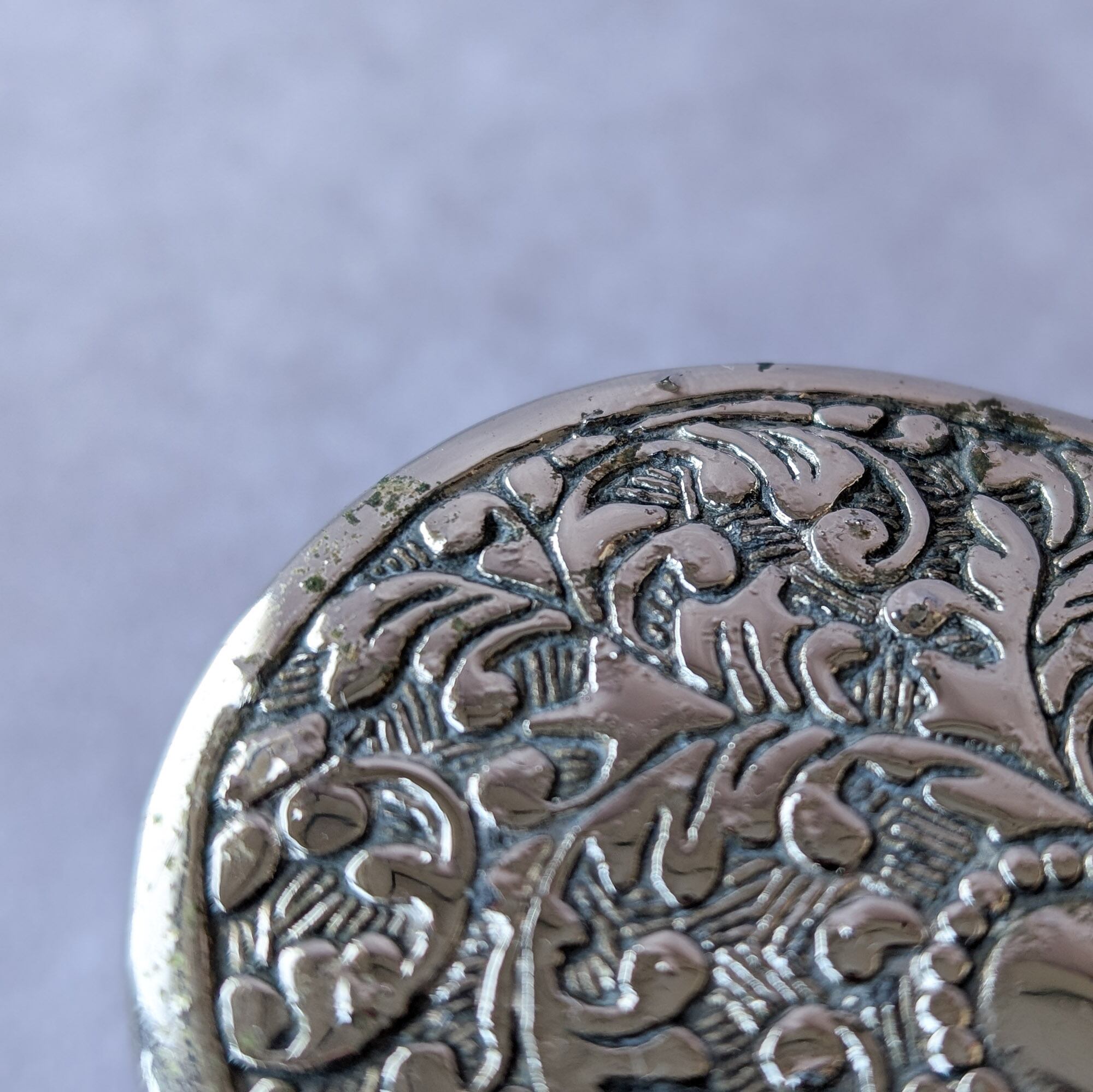 細やかな彫金が施されているシルバープレート(銀メッキ)のトリンケットボックス(小さなジュエリーボックス)です。